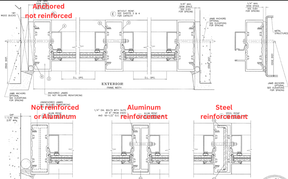 To withstand hurricane-force wind pressures, windows and doors need extensive anchoring and either aluminum or steel reinforcement. Storefront window jambs may be anchored to the structure, and this prevents deflection under pressure.